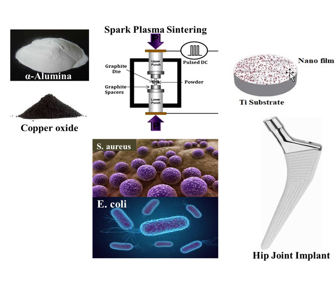 These findings highlight the potential of CuO/Al₂O₃ nanocomposite coatings to function as dual-purpose orthopedic implants by leveraging the antimicrobial and osteogenic properties of CuO morphologies. Evaluate the antimicrobial, bioactivity and in vitro cytotoxicity of the nanocomposite CuO/Al2O3 with two different morphologies of copper oxide, which was made with Spark Plasma Sintering (SPS) process on titanium substrate as an orthopedic implant. This innovation addresses critical challenges in implant technology, paving the way for safer and more effective biomedical solutions.